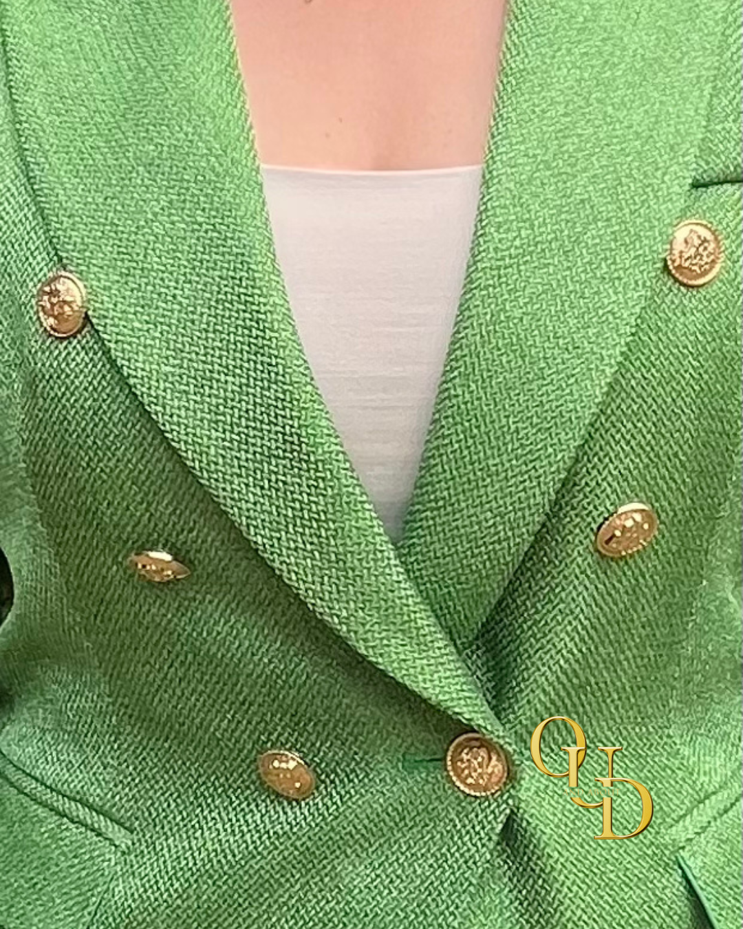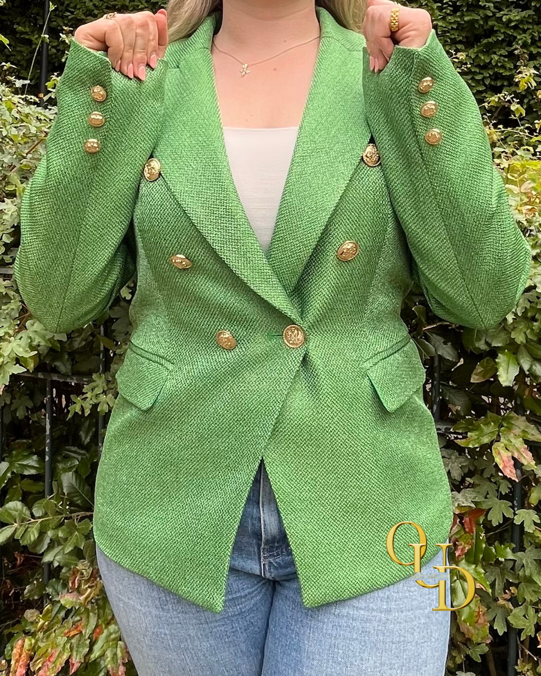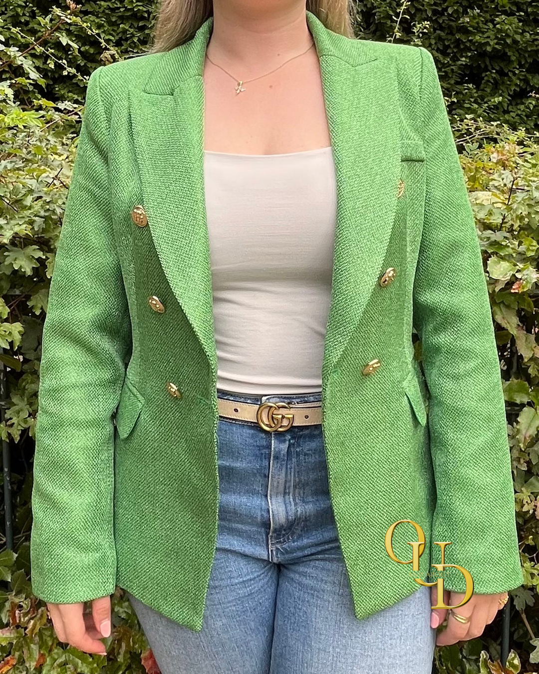 Maak kennis met de stijlvolle groene blazer van Affentif, een echte blikvanger dankzij zijn prachtige, elegante groene kleur. Deze blazer combineert tijdloze klasse met moderne verfijning en is perfect voor de vrouw die houdt van subtiele luxe. De verfijnde gouden knopen voegen een vleugje glamour toe, terwijl de getailleerde pasvorm je figuur prachtig accentueert. De blazer valt net over de heupen en heeft een elegante overslag wanneer hij gesloten wordt, wat zorgt voor een flatterende en stijlvolle uitstraling.