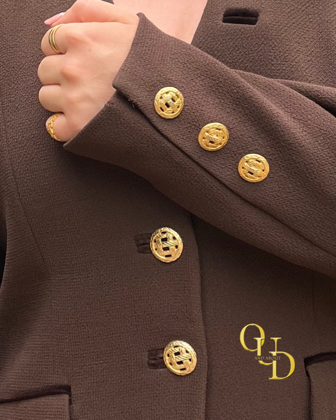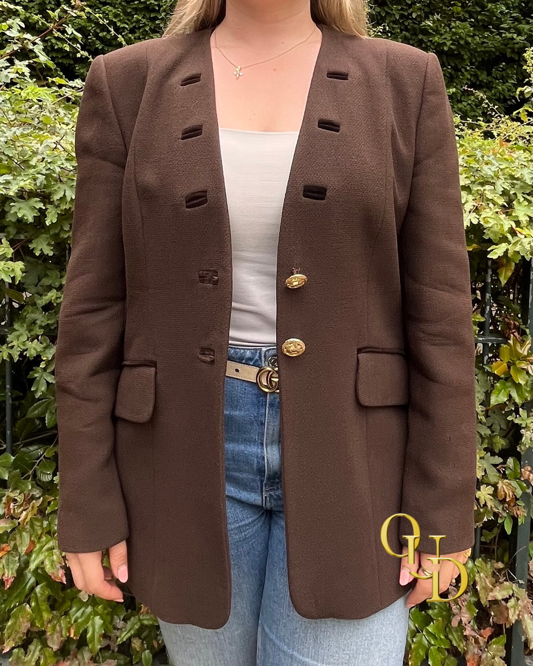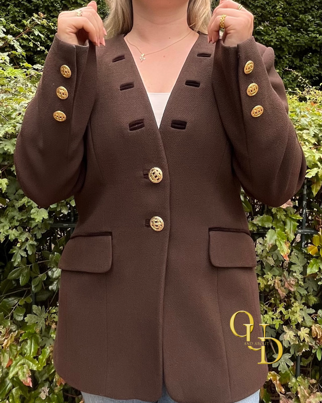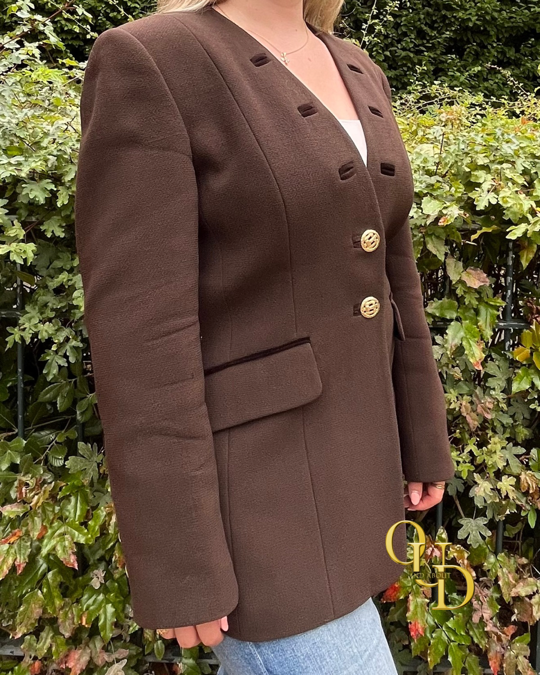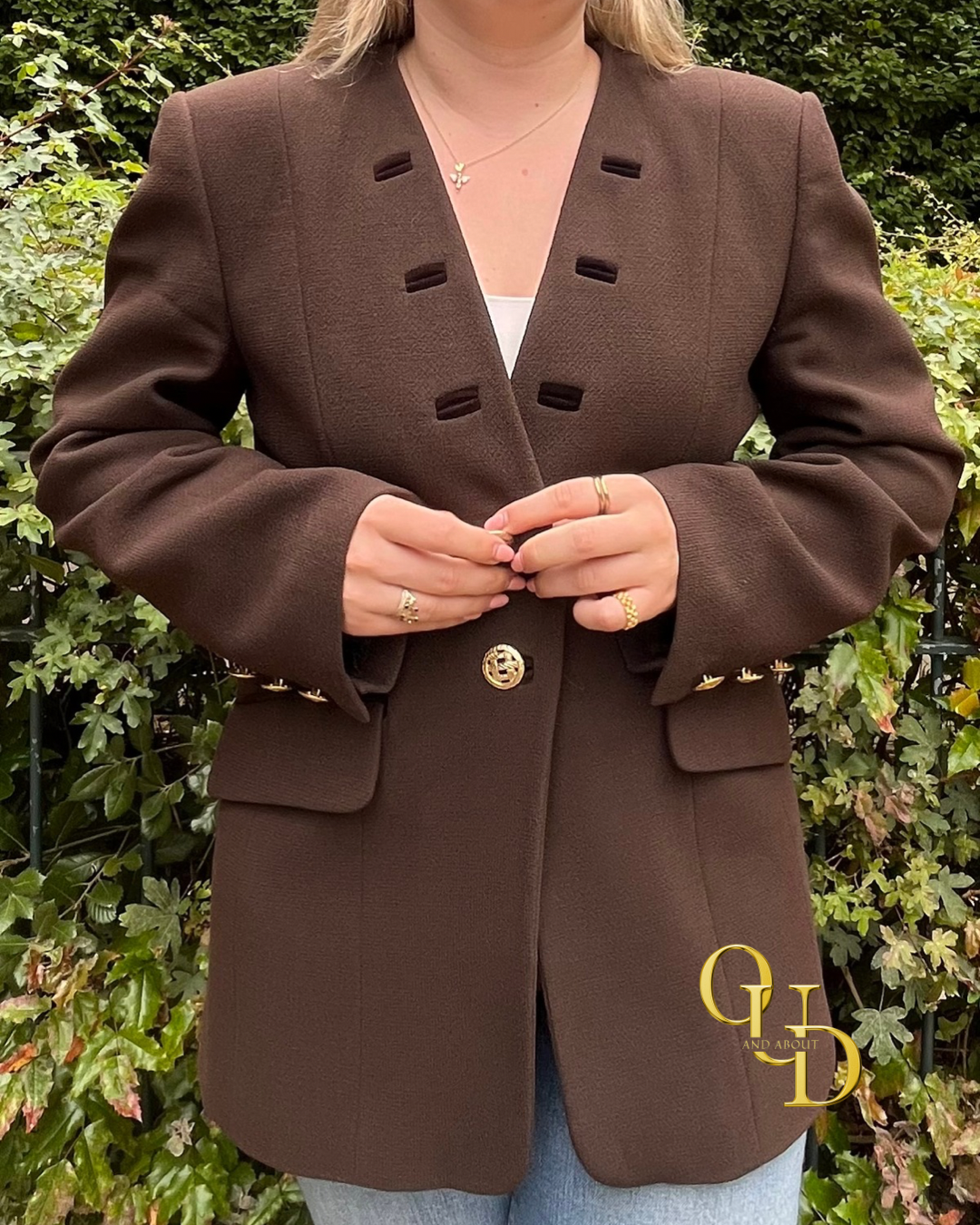 Maak kennis met het elegante jasje van Caroline Rohmer, uitgevoerd in een warme bruine kleur met verfijnde zwarte fluwelen details. De blazer is afgewerkt met luxe gouden knopen, die een prachtige contrast creëren en een vleugje verfijning toevoegen. Met een diepe V-hals en een getailleerde pasvorm sluit het jasje perfect aan en valt het iets langer aan de achterkant, wat zorgt voor een flatterend silhouet.