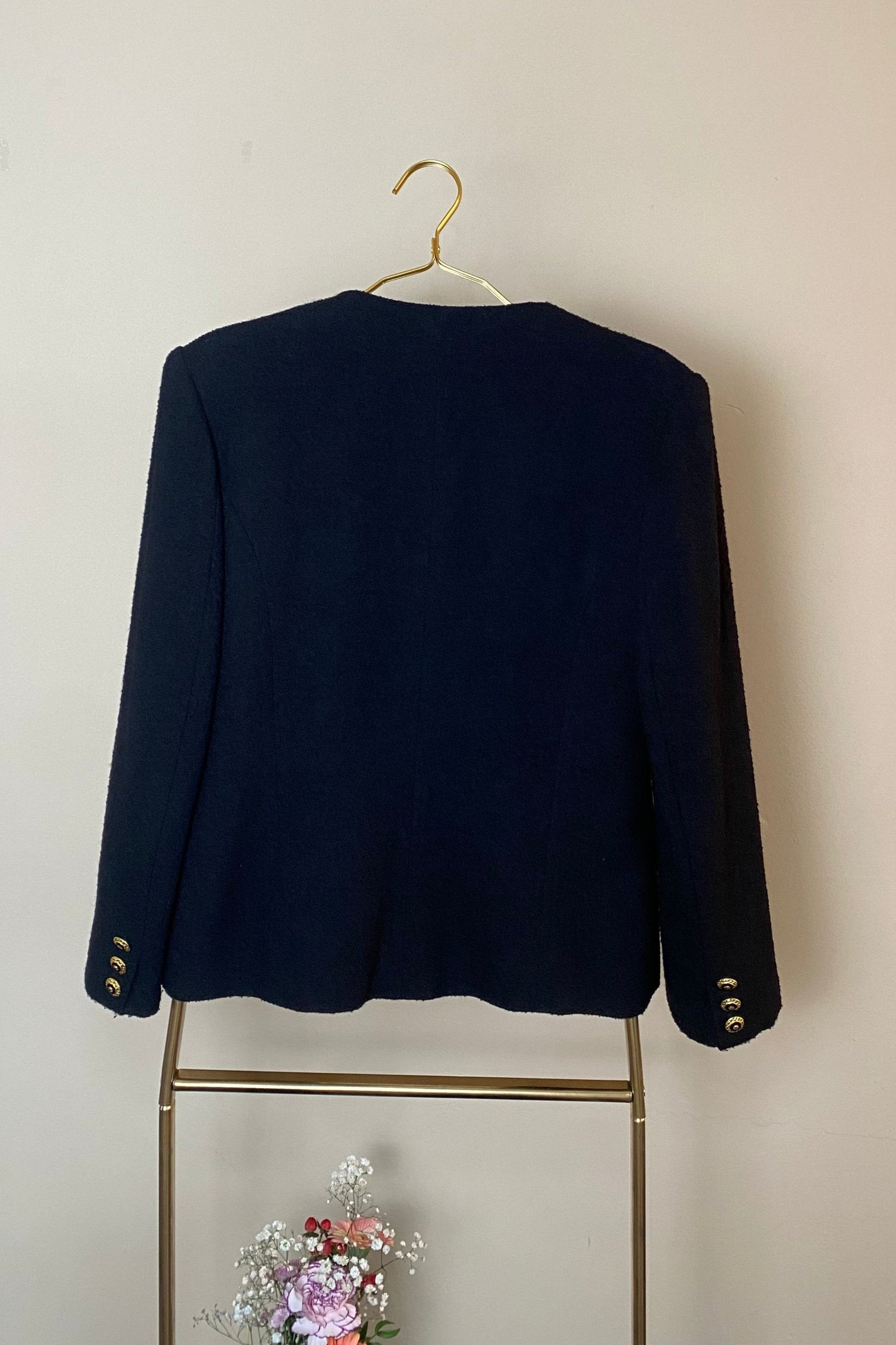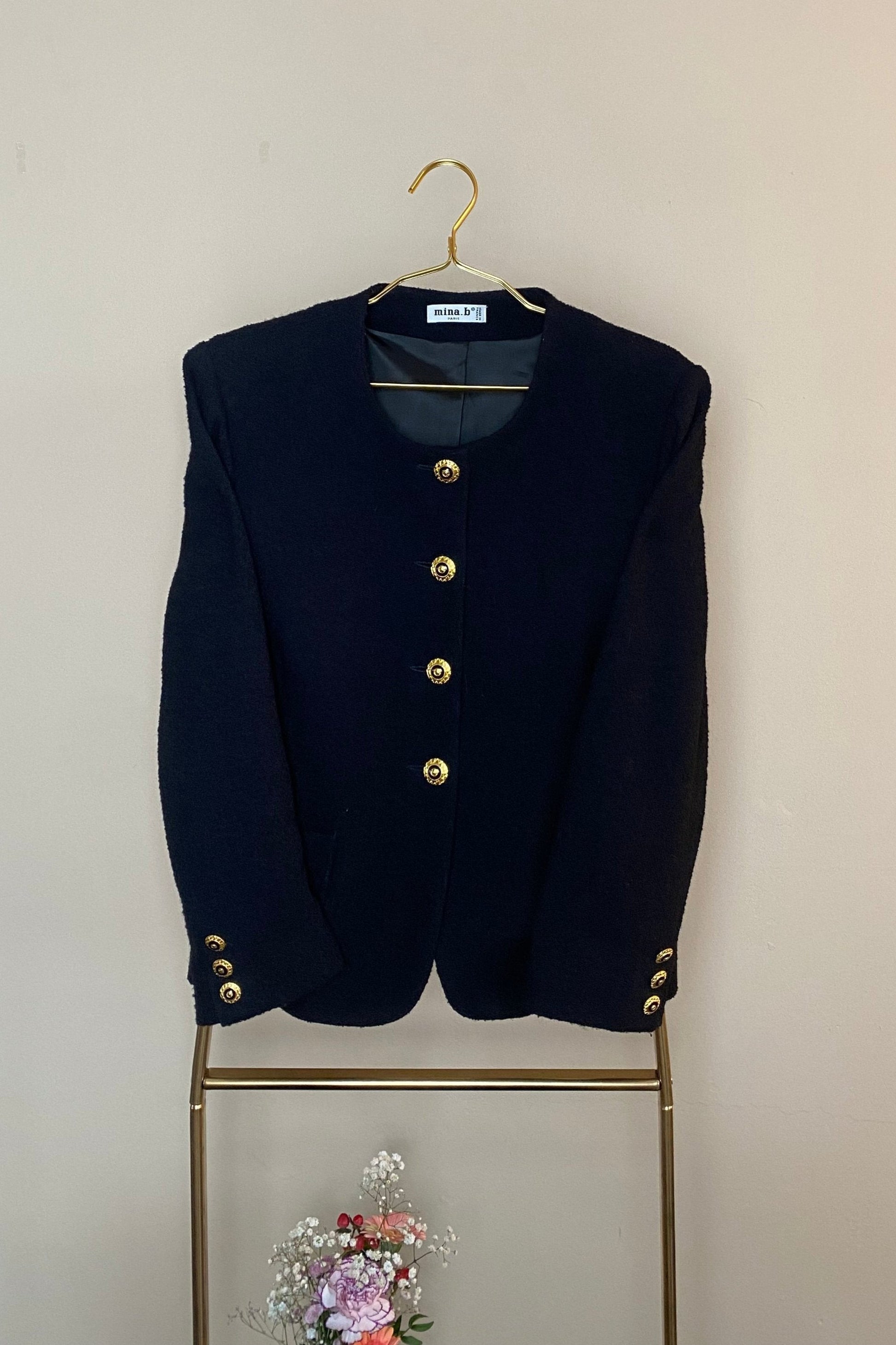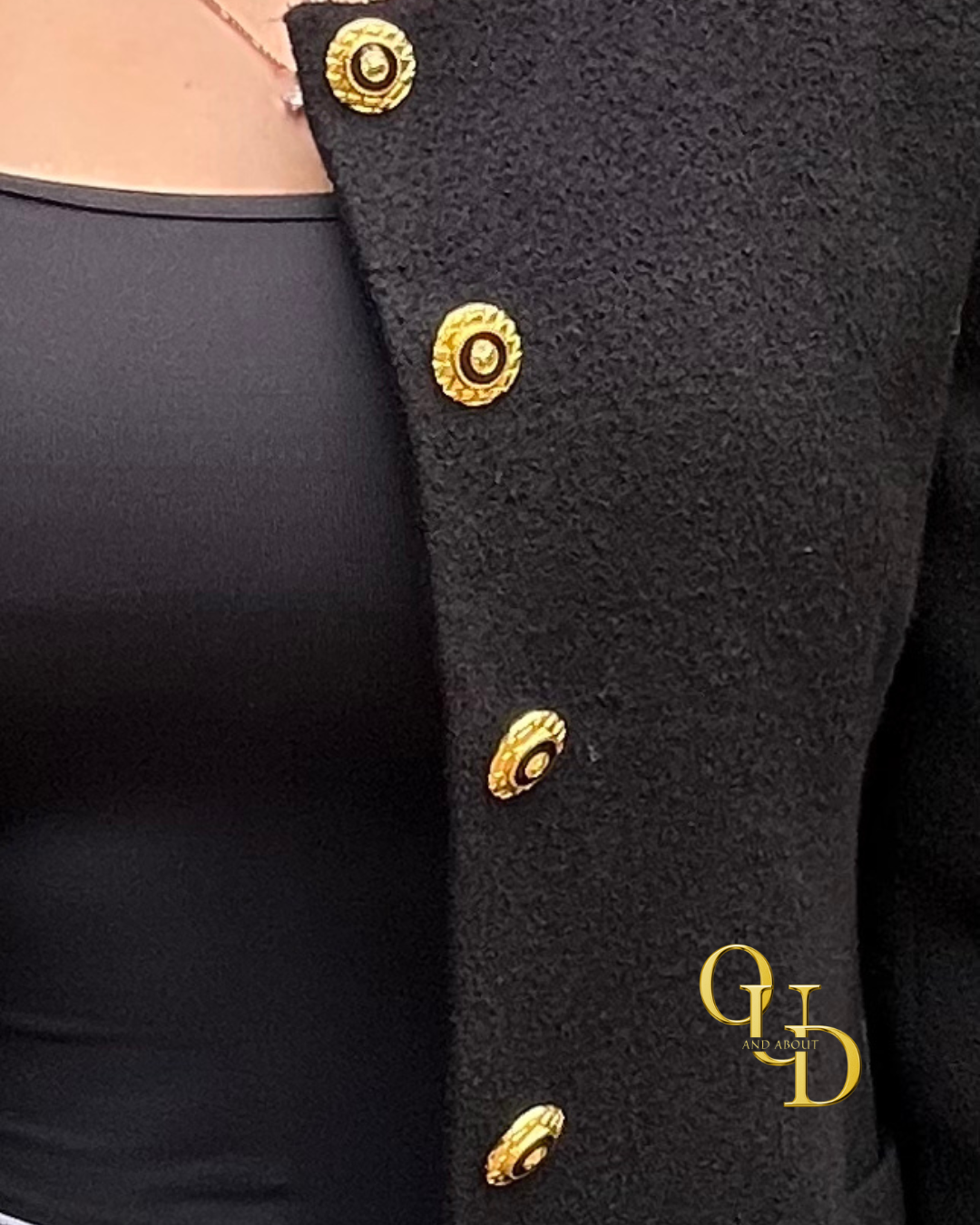 Ontdek de verfijning en kwaliteit van dit prachtige jasje van Mina B. Gemaakt van zacht zwart wol, straalt het jasje luxe uit door de gouden knopen met elegante zwarte accenten. De getailleerde snit en ronde halslijn zorgen voor een verfijnde, vrouwelijke look.