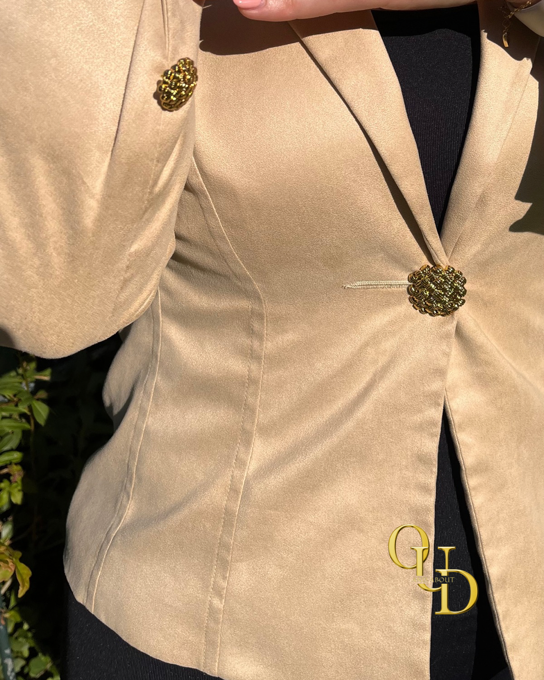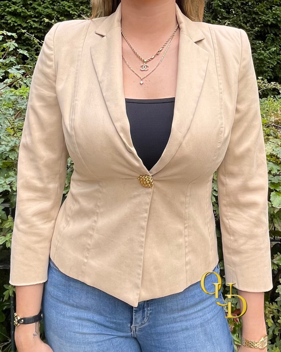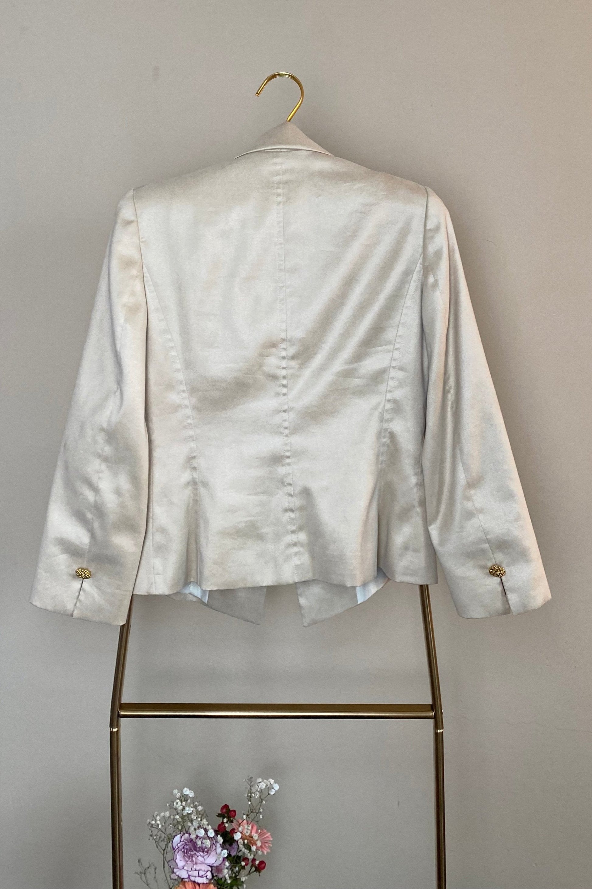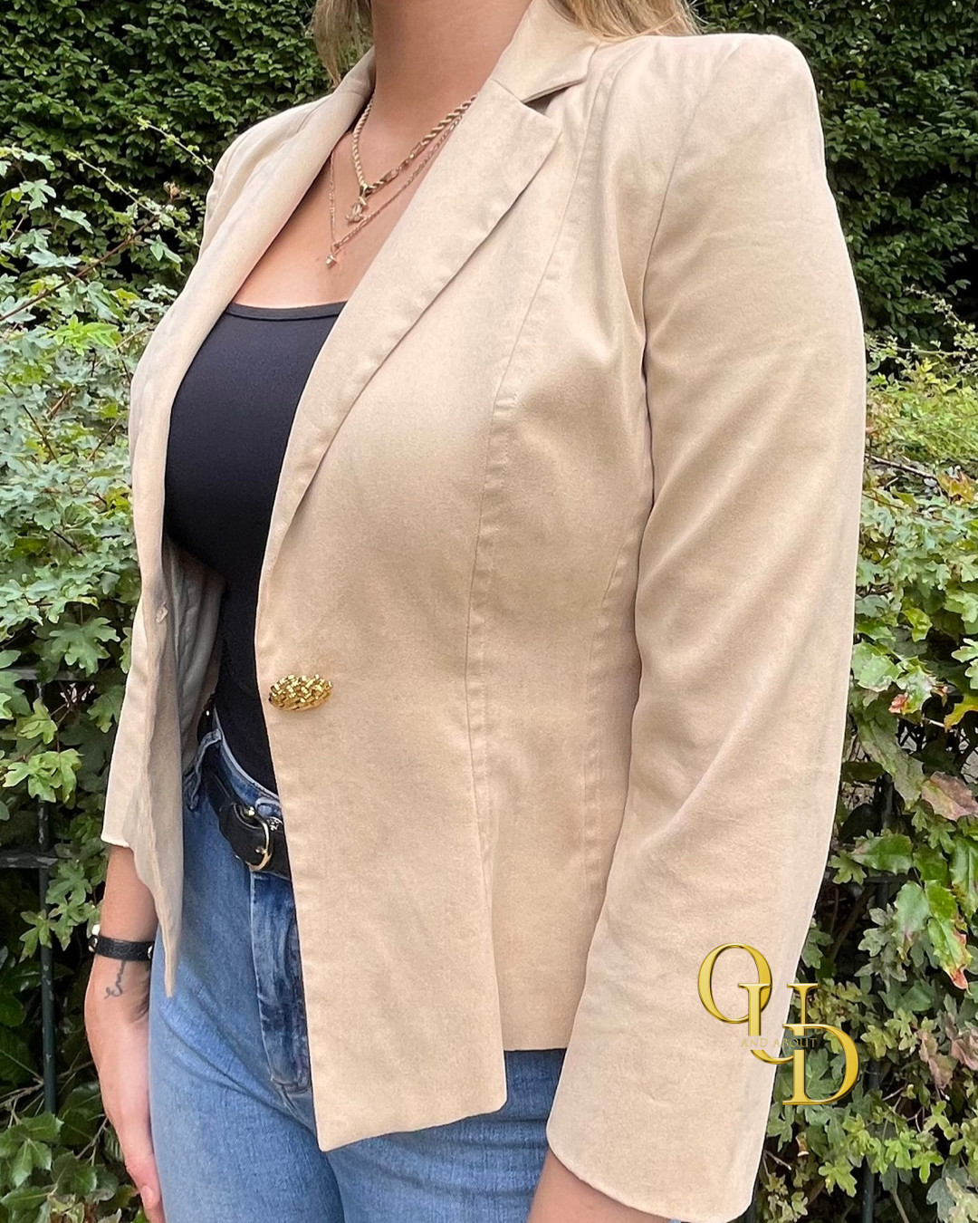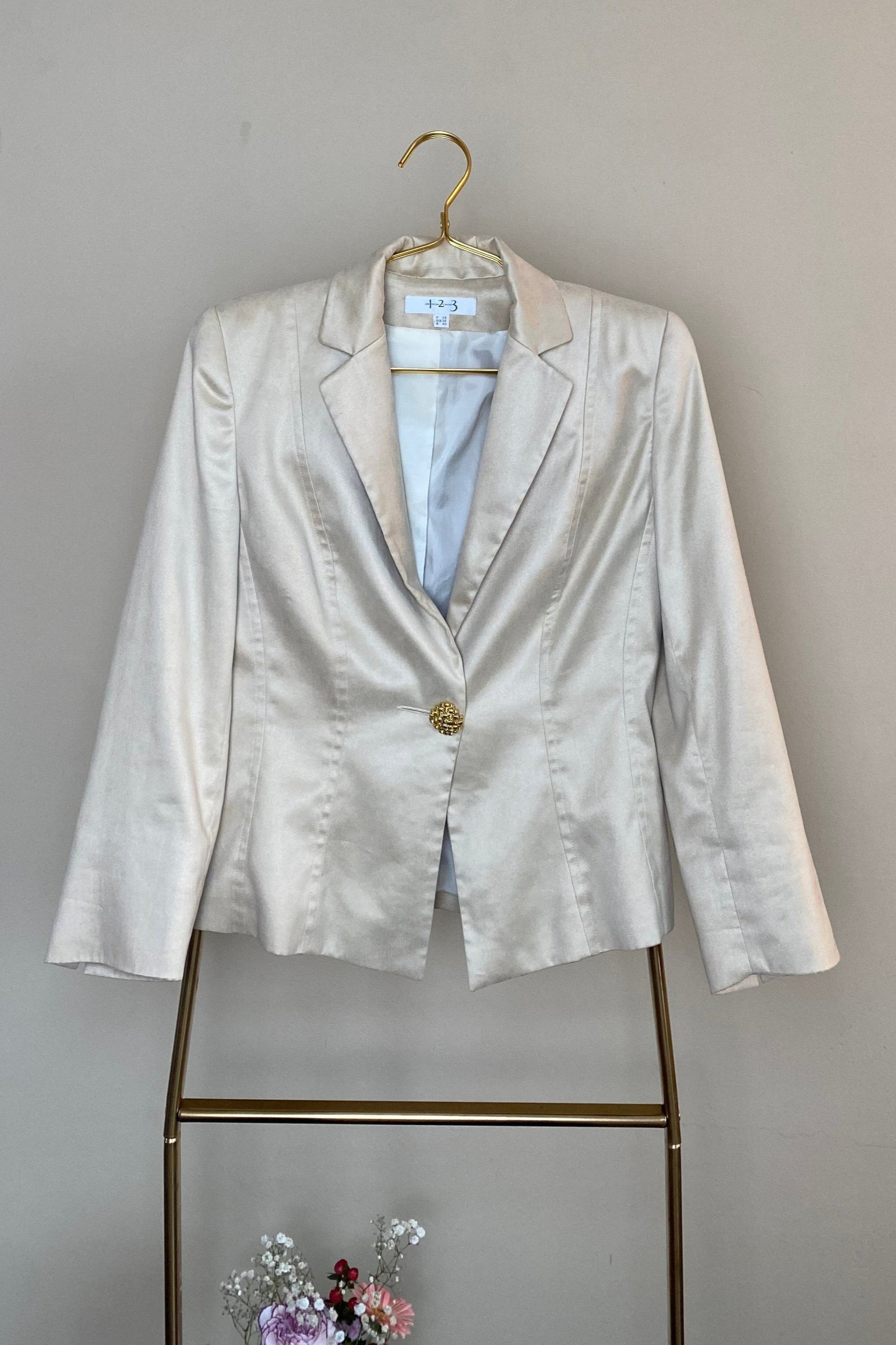 Ontdek de verfijning van deze prachtige beige blazer van Un1Deux2Trois3 Paris. Voorzien van unieke gouden knopen die een extra vleugje elegantie en detail toevoegen, ook op de mouwen. De stof is zacht en zijdeachtig, met een mooi gevoerde binnenkant voor extra comfort en luxe.