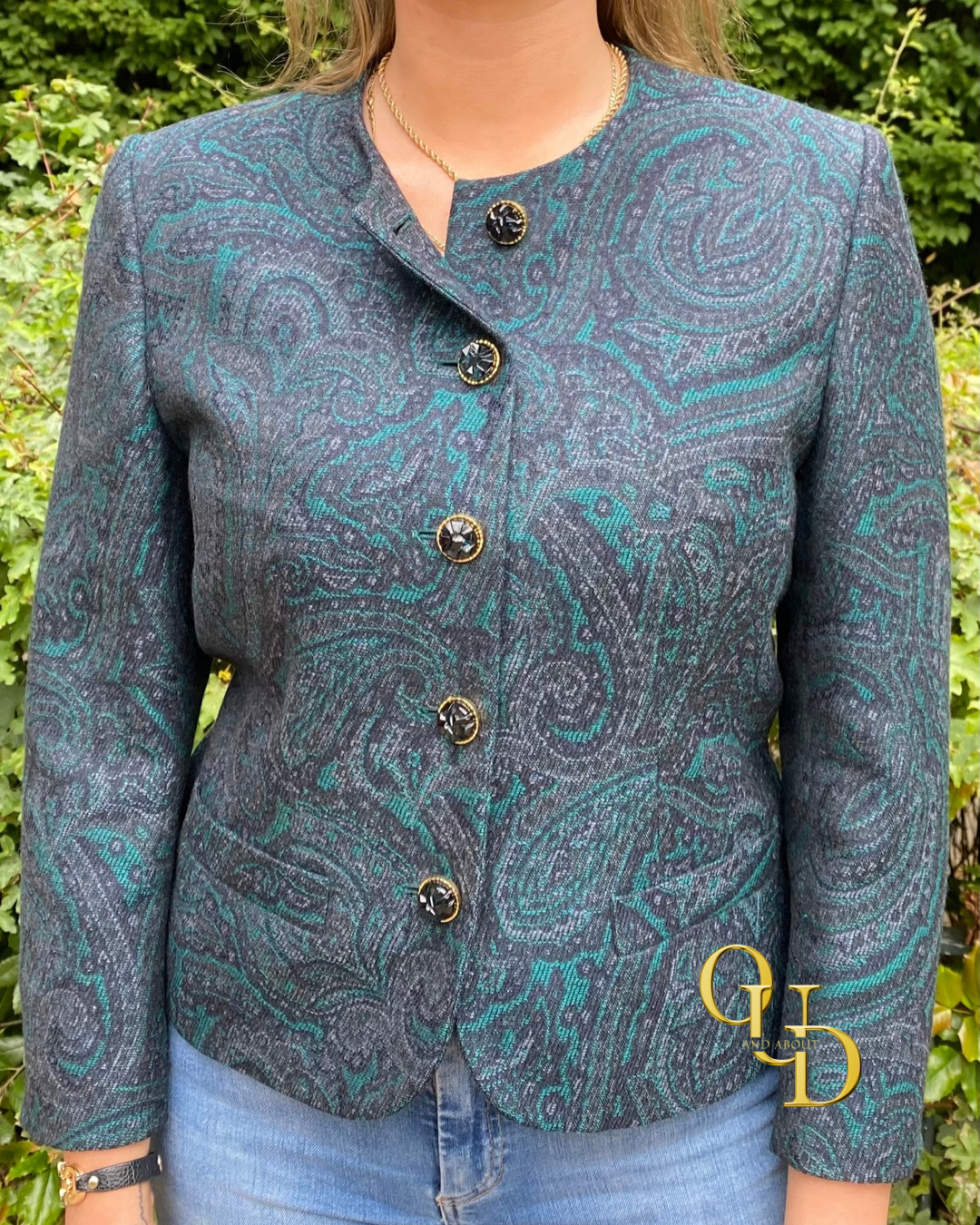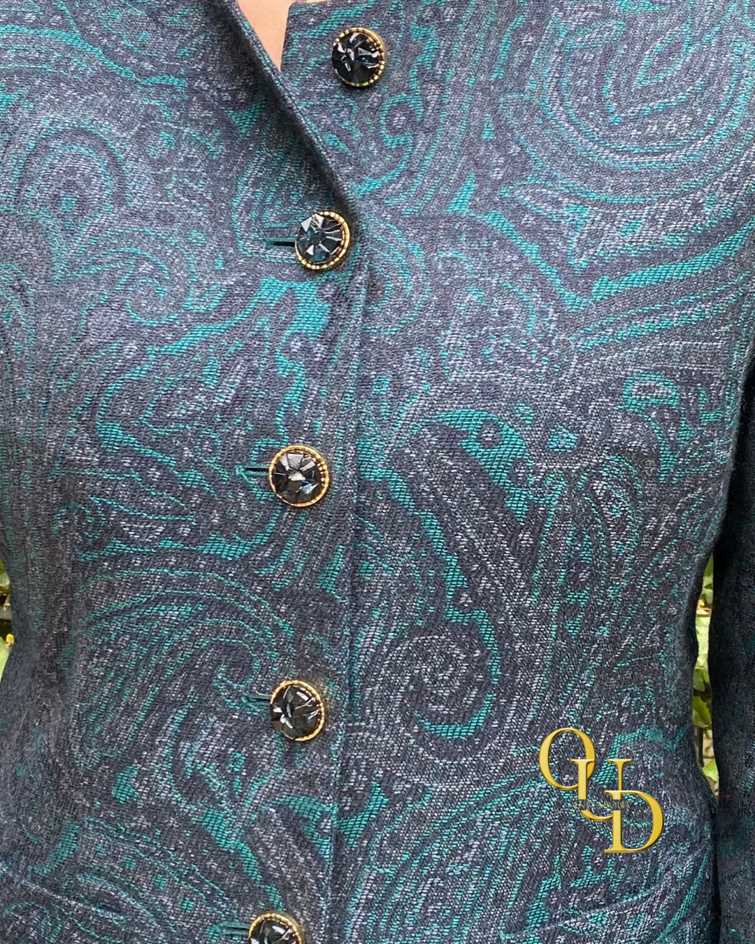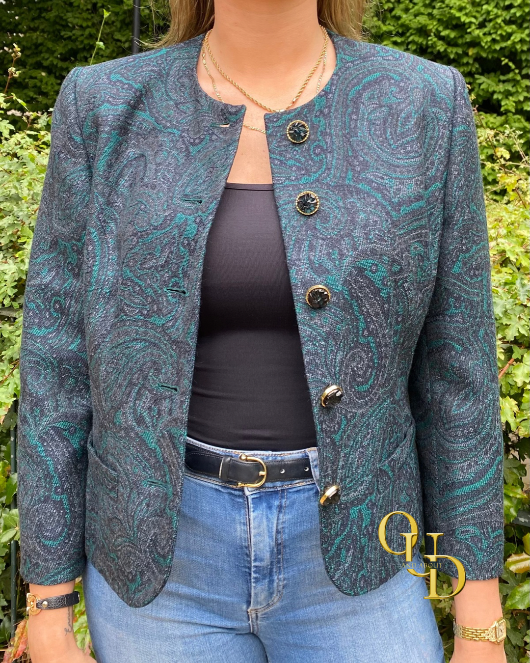 De blazer van Weinberg Paris springt meteen in het oog dankzij een opvallende, kunstzinnige print waarin de kleuren paars, turkoois en donkergroen harmonieus samenkomen. Deze blazer onderscheidt zich door een unieke print waarin de kleuren paars, turkoois en donkergroen prachtig samenkomen. De knopen zijn werkelijk bijzonder, uitgevoerd in goud en versierd met een schitterende steen, wat de blazer een luxe uitstraling geeft. Met een elegante afwerking en een getailleerde pasvorm, biedt dit kledingstuk een perfecte balans tussen stijl en verfijning.